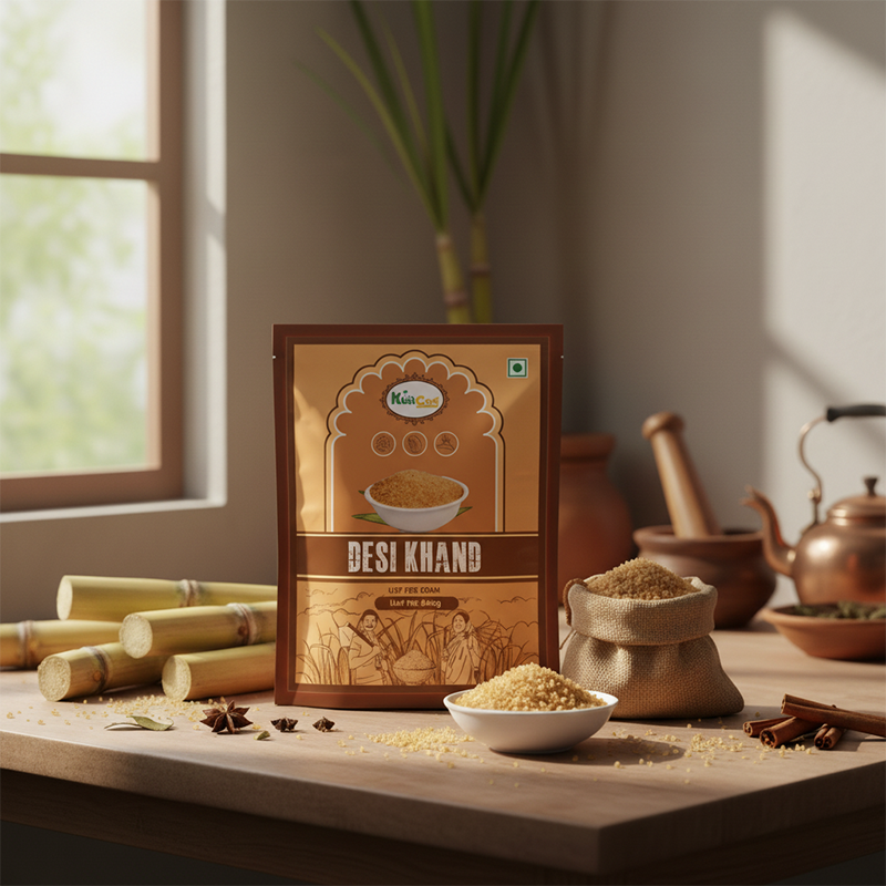 Khetcart Desi Khand is an unrefined, natural sweetener made from pure, desi sugarcane juice using traditional methods, free from chemicals and bleaching agents - contains minerals like calcium, iron and magnesium, a healthier alternative to refined sugar.